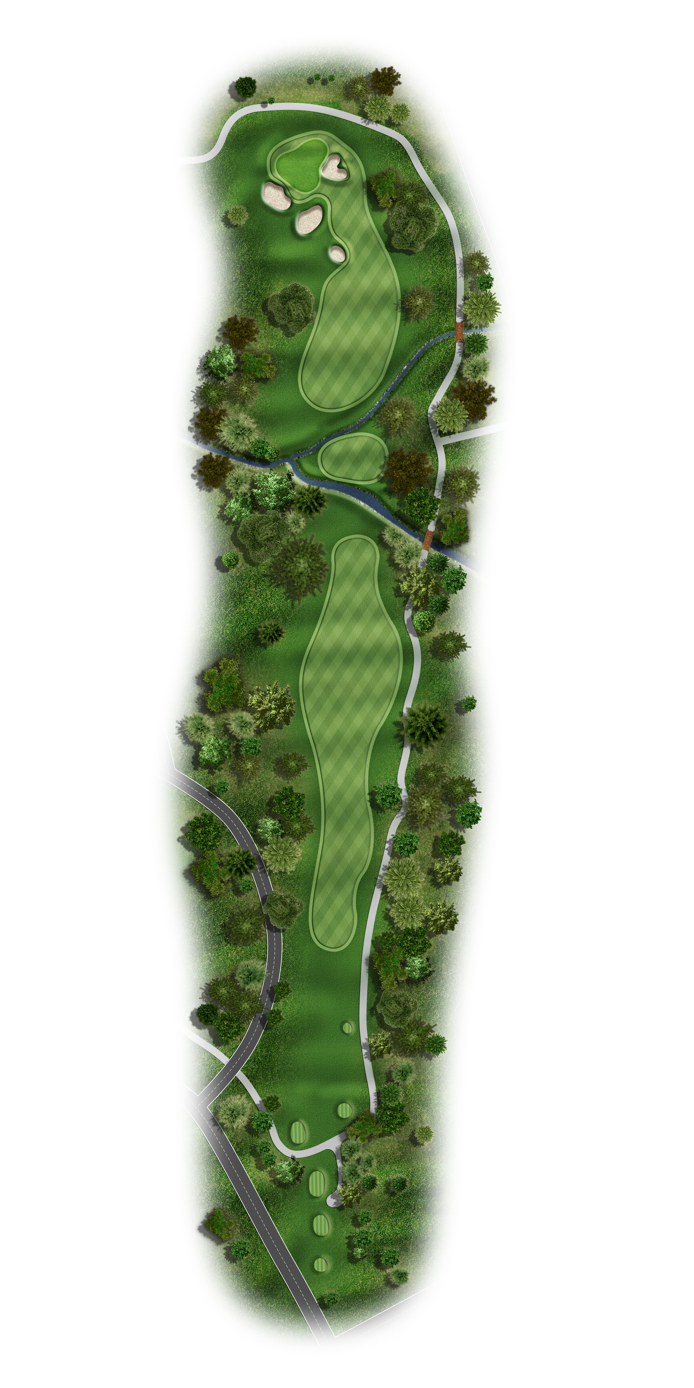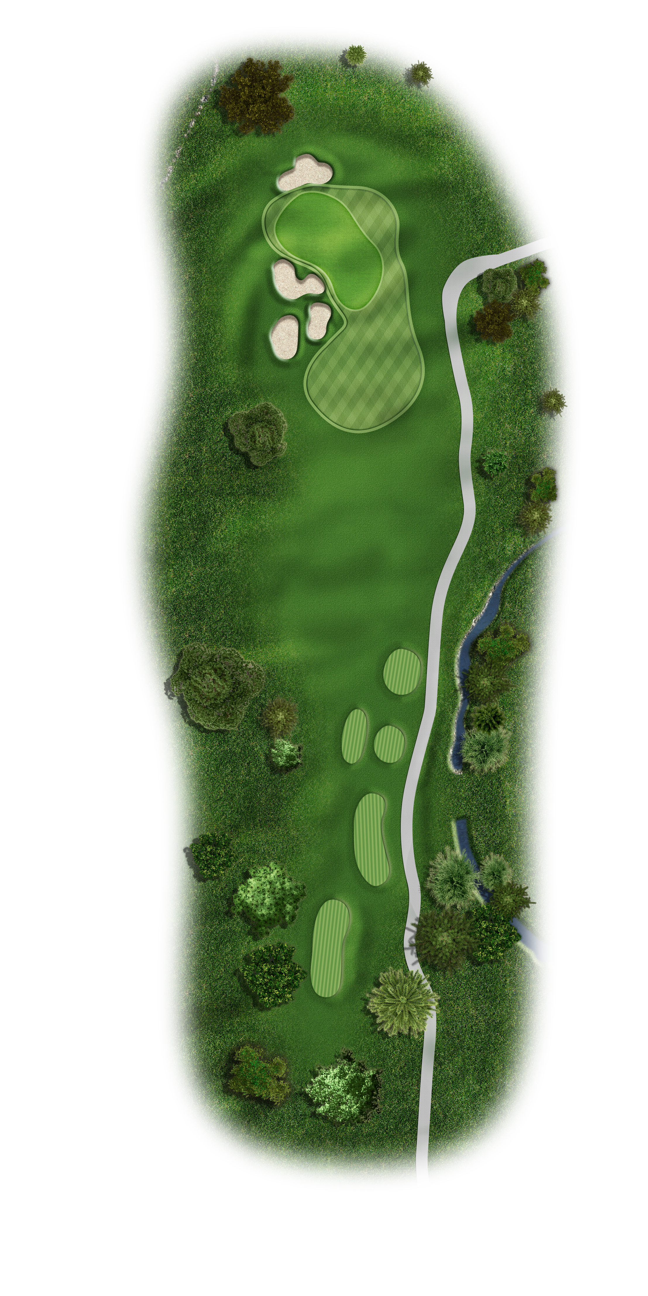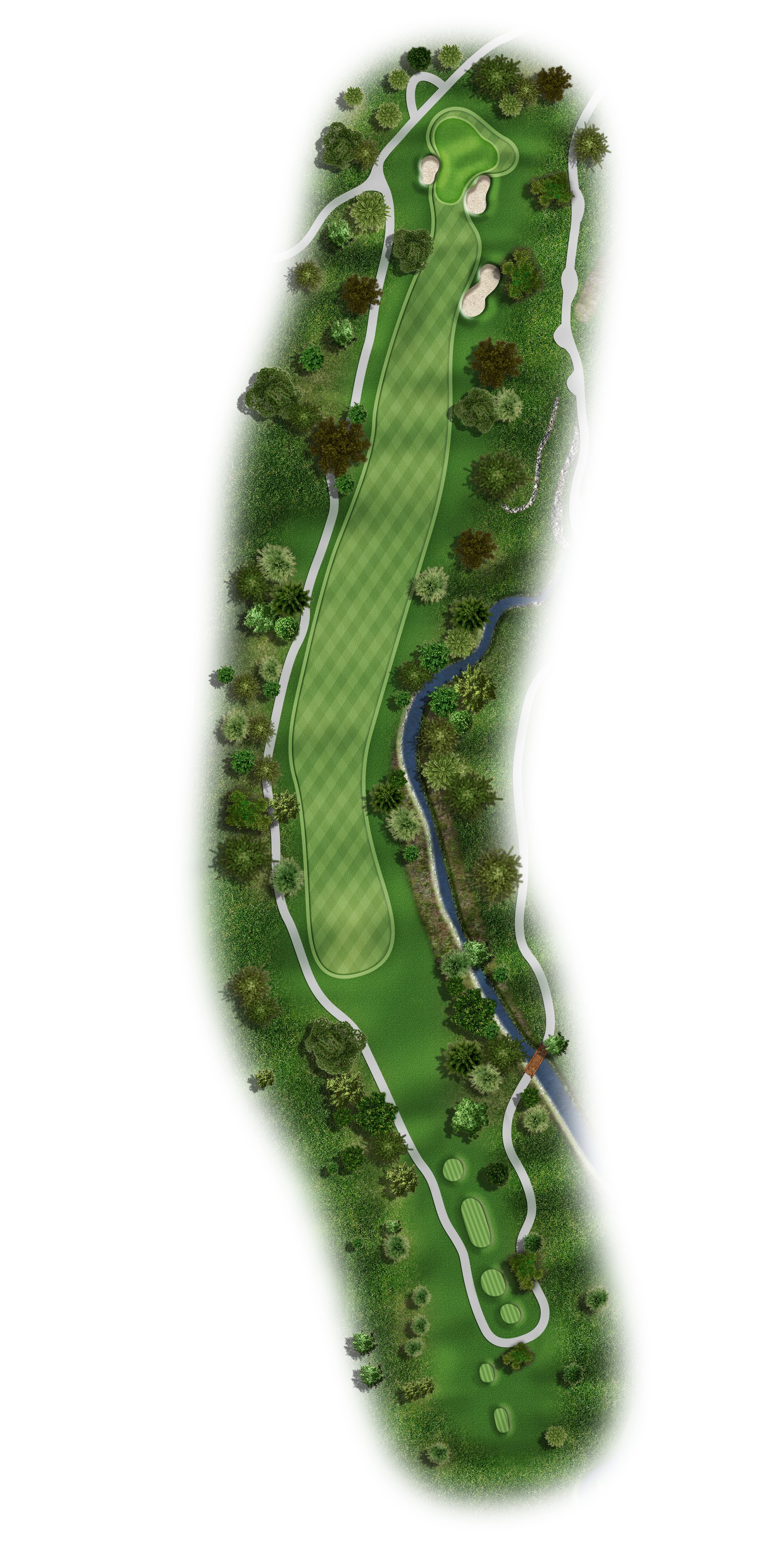 Favor the left side with your tee shot to avoid the creek running the entire right side of this fairway on this Par 5. Your target for your second shot is just to the right of the last tree on the left and allow the natural terrain to move the ball right on the ground. Your approach should be 140 to 100 yards to a very undulating green. Keep your ball below the hole.
