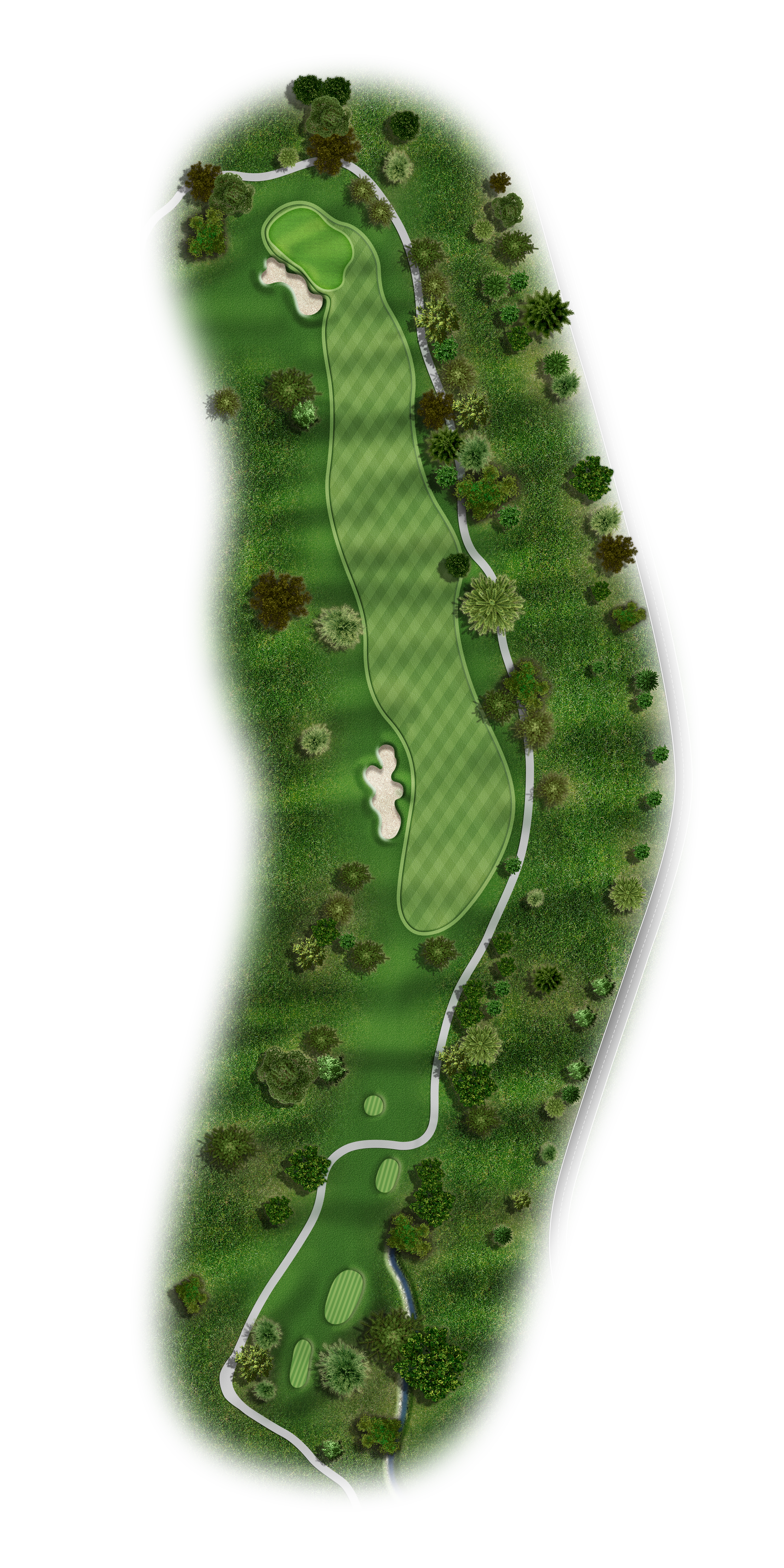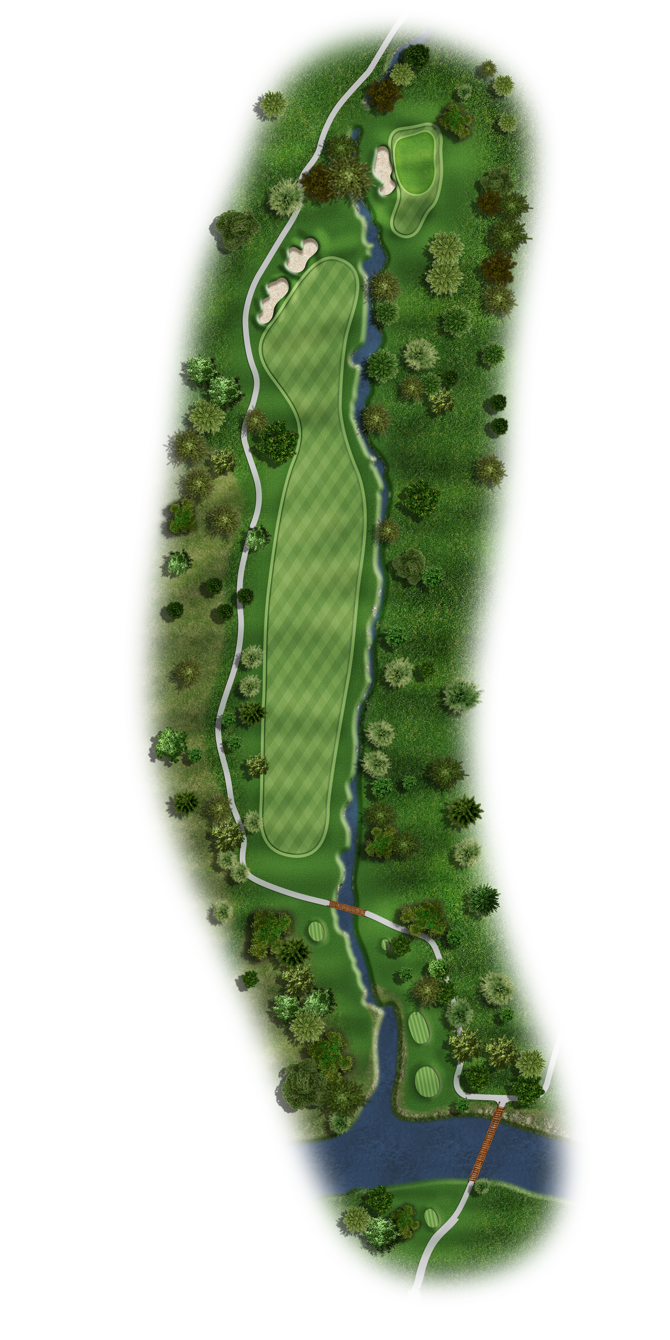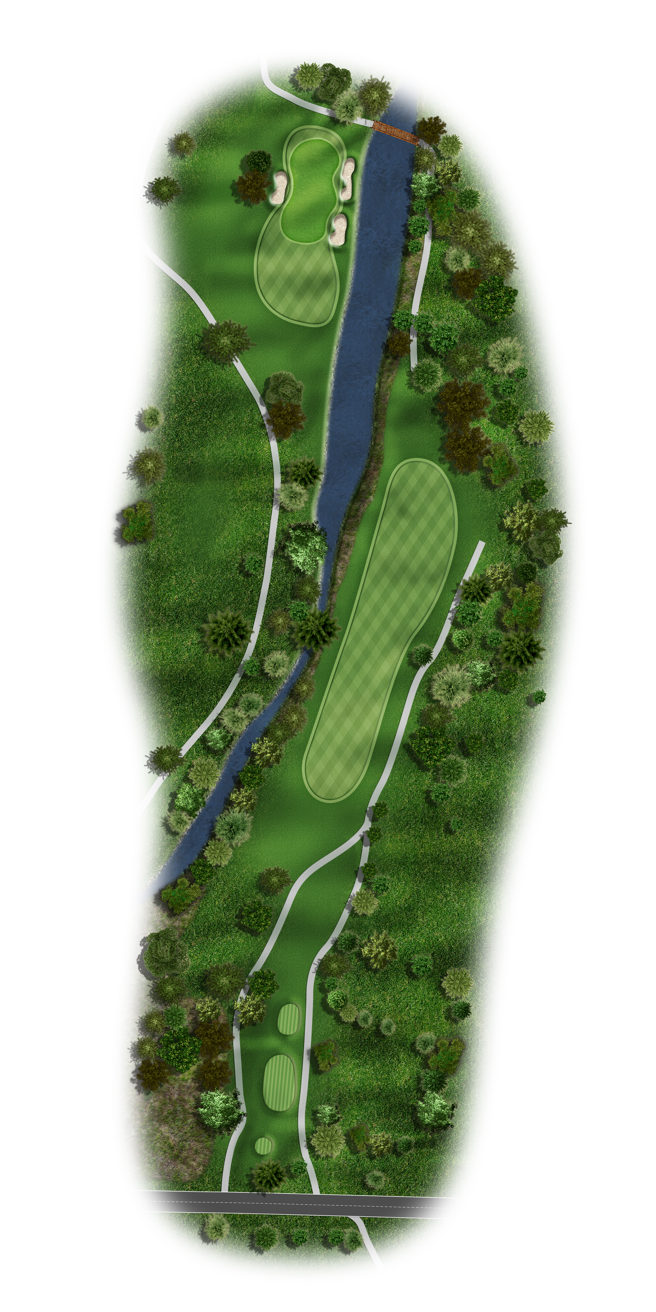 Favor the left side with your tee shot to avoid the creek running the entire right side of this fairway on this Par 5. Your target for your second shot is just to the right of the last tree on the left and allow the natural terrain to move the ball right on the ground. Your approach should be 140 to 100 yards to a very undulating green. Keep your ball below the hole.